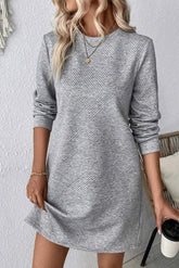 The textured A-line mini dress combines timeless elegance with contemporary style. The textured fabric adds visual interest and dimension, while the round neckline flatters effortlessly. Long sleeves provide warmth and sophistication, and the mini length keeps the look fresh and modern. Perfect for layering across seasons, this versatile dress transitions seamlessly from professional settings to casual outings.