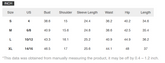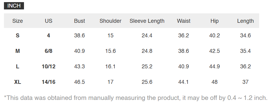 SizeUSBustShoulderSleeve LengthWaistHipLengthS438.61524.436.240.234.6M6/840.915.624.838.642.535.4L10/1243.316.125.240.944.936.2XL14/1646.51725.644.14837
